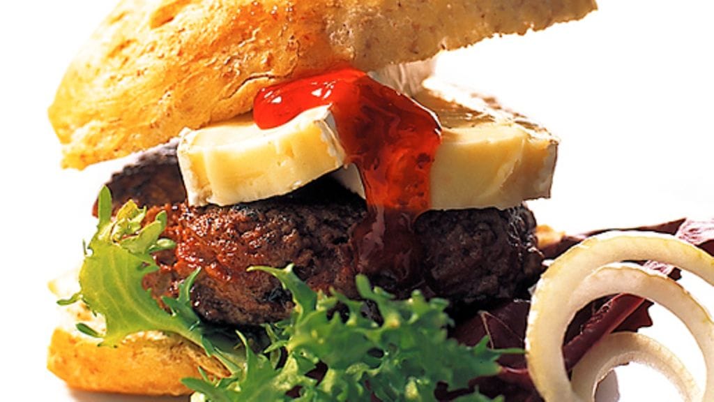 2 Kuori sipuli ja leikkaa se renkaiksi. Halkaise hampurilaissämpylät ja pane alaosa lautaselle. Lisää leivän päälle salaatinlehtiä, sipulia, vastagrillattu hampurilaispihvi, briejuustoviipale ja ruokalusikallinen mango chutneyta. Pane päällimmäiseksi leivän kansi.