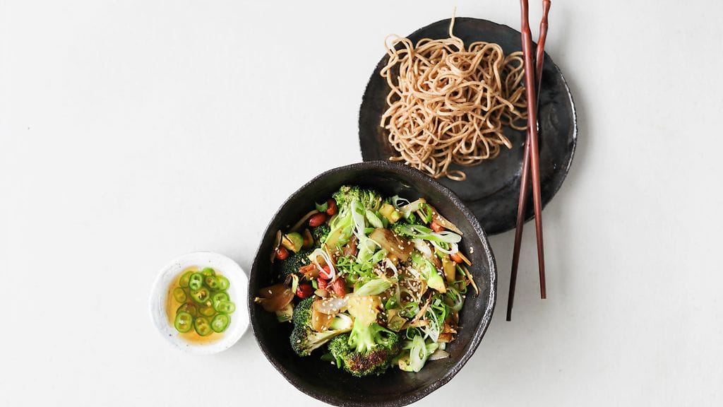 Irrota parsakaalin kukinnot ja puolita isoimmat. Poista kannan kuiva pääty ja leikkaa kanta ½ cm:n lastuiksi. Leikkaa paprika ja sipuli lohkoiksi ja hienonna inkivääri ja valkosipuli. Hienonna kevätsipulit.