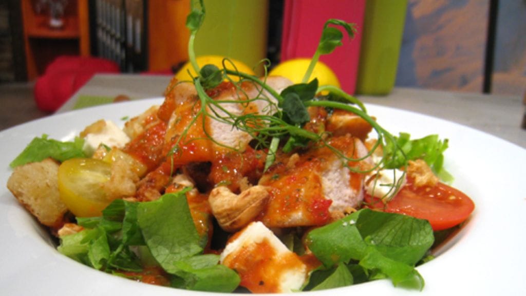 Cashewpähkinät antavat broilersalaatille täytettä. Paprikavinaigrette maustaa kokonaisuuden.