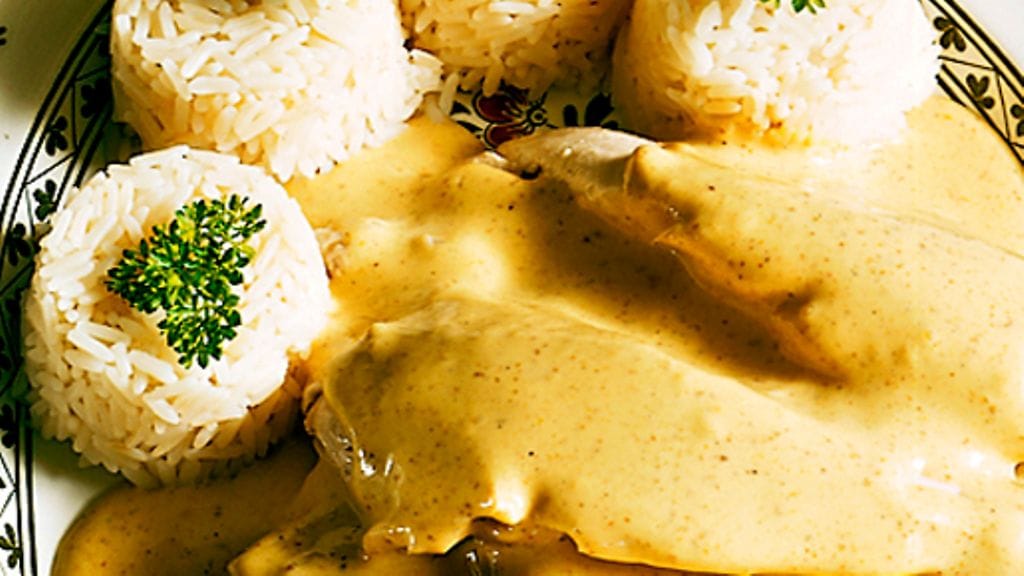 3. Kuullota currya voissa kasarissa muutama minuutti, sekoita joukkoon jauho ja lisää siivilöity keitinliemi sekä kerma sekoitellen. Keitä noin 10 minuuttia. Kaada kastike lihapalojoen päälle. Tarjoile keitetyn riisin ja salaatin kanssa.