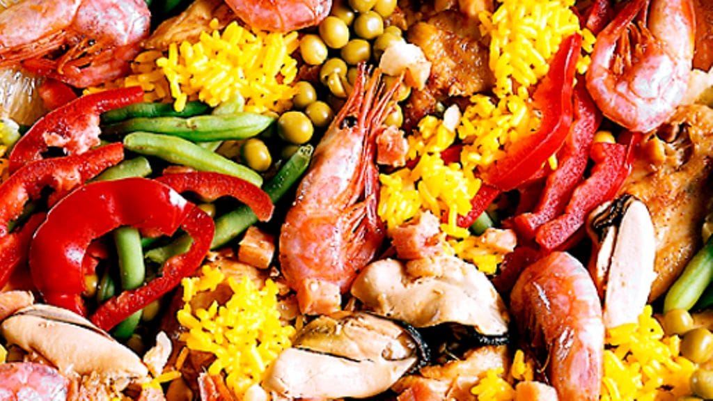1. Ruskista kanapalat öljyssä paistinpannulla ja siirrä ne pataan. Ruskista sitten kinkkukuutiot ja sipulisilppu ja siirrä nekin pataan, samoin valkosipulisilppu. Murenna joukkoon liemikuutio, mausta suolalla, pippurilla ja paprikajauheella. Kaada päälle vettä niin, että liha lähes peittyy. Kuumenna kiehuvaksi ja keittele hiljalleen kannen alla noin 25 minuuttia. Katkaise virta keittolevystä padan alta. Lisää pataan vihreät pavut, herneet, paprikasiivut ja valutetut simpukat. Sulje kansi.