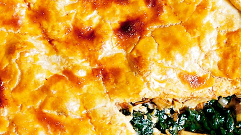 3. Kauli taikinasta vuokaan sopiva kansi ja laita se aineksien päälle. Pistele muutama höyryreikä ja tee mahdollisesti pinnalle koristeita taikinanrippeistä. Penslaa vispatulla munalla ja paista uunin keskitasolla noin 25 minuuttia, tai kunnes piiraan kansi on kauniinvärinen.