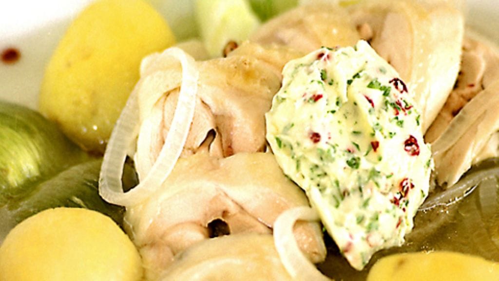 1. Kuori ja kuutioi juuriselleri. Kuori ja viipaloi toinen porkkana lanteiksi. Puhdista purjo ja suikaloi se. Kuori perunat. Pane broileripalat, laakerinlehti, selleri, timjami, porkkana, purjo ja perunat kattilaan. Kaada päälle vettä, niin että ainekset peittyvät. Kuumenna kiehuvaksi ja keitä hiljalleen kannen alla 20 minuuttia. Nosta broileripalat ja perunat pois kattilasta ja laita syrjään odottamaan. Siivilöi liemi puhtaaseen kattilaan.