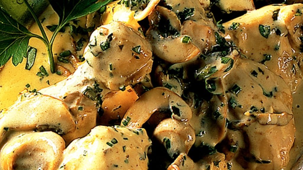 3. Keitä broileripalojen keitinlientä kokoon, kunnes jäljellä on noin 4 dl. Lisää 1 dl kermaa ja hauduta pari minuuttia. Vatkaa munankeltuaiset ja 1 dl kermaa ja lisää seos kuumaan kastikkeeseen kokoajan voimakkaasti vatkaten. Älä anna kastikkeen kiehua, jotta se ei juoksetu, vaan hauduta miedolla lämmöllä. Mausta sitruunalla, suolalla ja vastajauhetulla valkopippurilla. Siivilöi kastike broilerinpalojen ja herkkusienten päälle. Ripottele pinnalle hienonnettua persiljaa ja tarjoa heti.