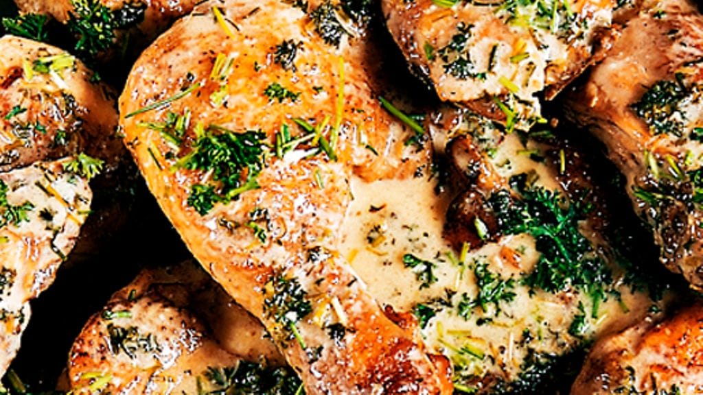 3. Nosta lihat padasta, lisää liemeen kerma ja silputut vihreät yrtit. Kiehauta, laita lihat takaisin kastikkeeseen ja keitä vielä 5 minuuttia.