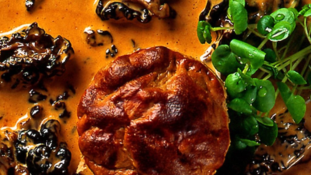 2. Korvasienikastike: Kuori ja silppua sipuli. Murskaa katajanmarjat. Sulata puolet voista kasarissa, lisää sienet ja sipuli, kuullota kunnes sipuli on läpikuultavaa. Nosta liedeltä ja sekoita joukkoon jauho. Nosta takaisin levylle ja sekoita joukkoon viini, kanaliemi, kerma, katajanmarjat, suola ja pippuri. Kiehauta sekoittaen ja hauduta vielä 5 minuuttia. Sekoita kastikkeeseen loput voista vasta juuri ennen tarjoilua.