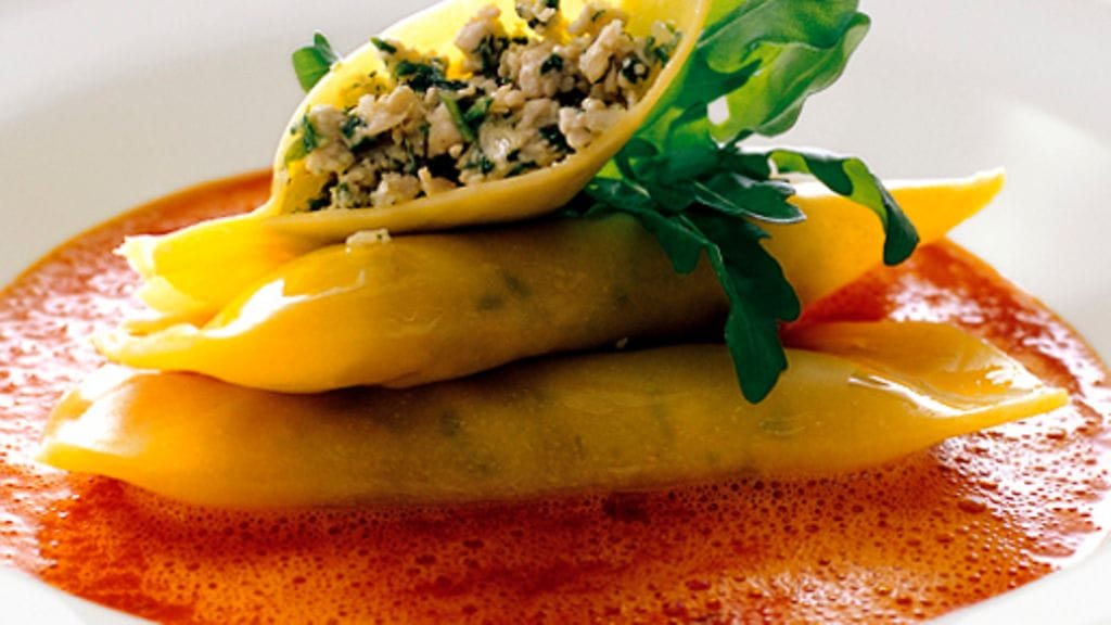 2. Leikkaa lasagnelevyistä pyörylöitä (ylösalaisin käännetyn kulhon avulla) ja annostele jokaisen pyörylän keskelle lusikallinen broileritahnaa. Voitele pyöryköiden reunat munakeltuaisella ja taita yhteen nyytiksi. Kiinnitä cocktail-tikulla. Keitä nyyttejä suolalla maustetussa vedessä noin viisi minuuttia.