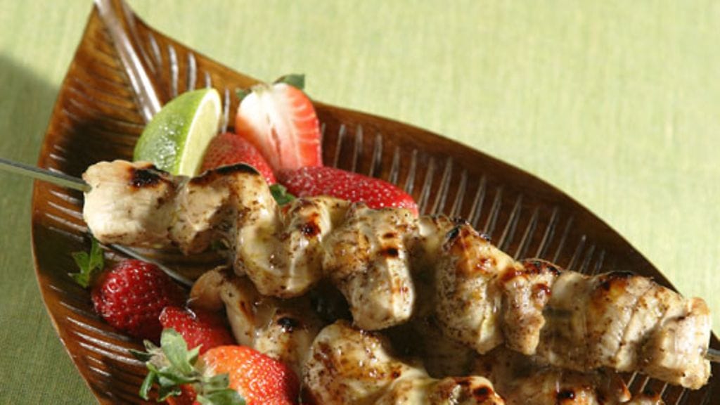 Grillaa tai paista vartaat kypsiksi 200–asteisessa uunissa noin 20 minuuttia. Tarjoile Rajamäen Valkoisen Balsamicokastikkeen kanssa.