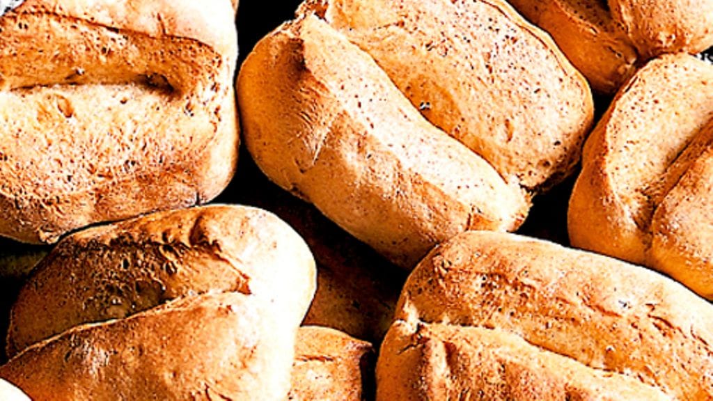 3. Paista uunin keskitasolla noin 10 minuuttia. Penslaa sämpylät nopeasti kuumalla vedellä, nosta takaisin uuniin, käännä uuni pelkästään ylälämmölle, ja paista vielä 5-10 minuuttia.