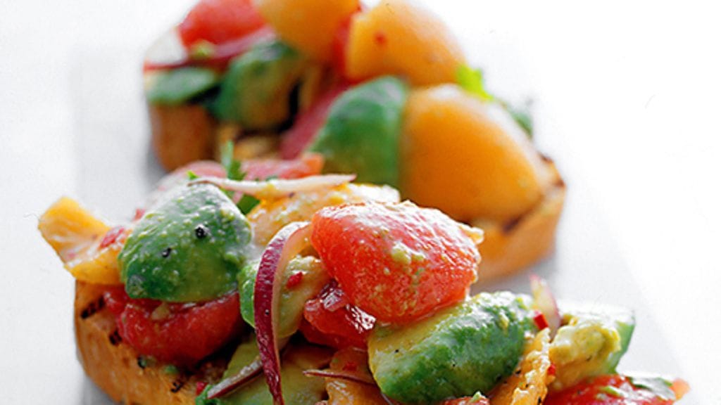 3. Paahda tai grillaa leipäviipaleet. Levitä tomaatti-avokadotahna heti leiville ja tarjoile.