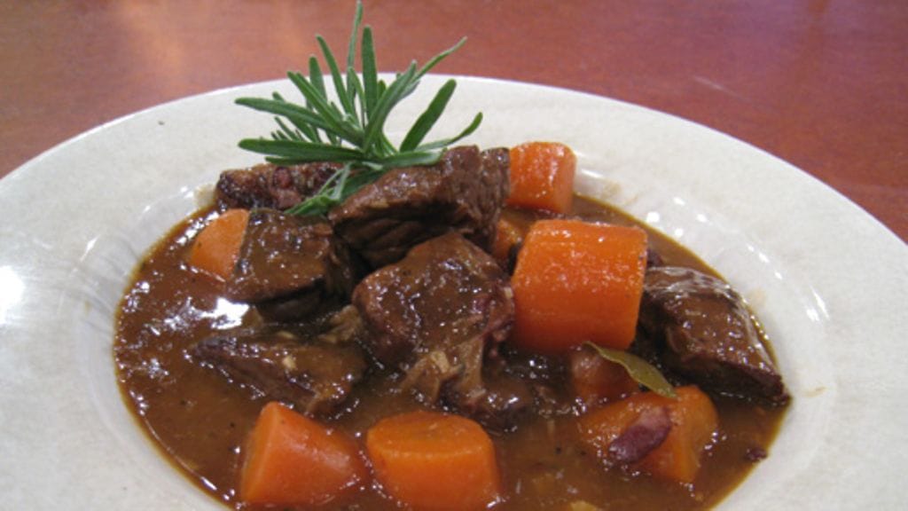 Lisää sipulit, porkkanat, mausteet ja kuullota. Sekoita joukkoon tomaattipyree ja vehnäjauhot. Kaada joukkoon punaviini ja vesi. Hauduta miedolla lämmöllä noin kahdesta kolmeen tuntia lihapalojen koosta ja mureudesta riippuen kunnes liha on kypsää.
