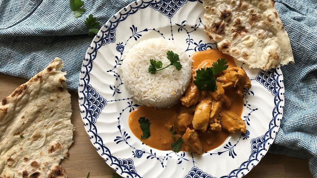 - Valmista curry. Broilerit kannattaa paistaa kahdessa erässä. Sulata puolet voista isolla pannulla ja nostele puolet broilereista marinadista ruskistumaan pannulle. Marinadia ei tarvitse valuttaa pois, mutta sitä ei myöskään kannata kaataa kulhosta ylimääräistä pannulle. Ruskista broilereita muutama minuutti ja nostele isoon kattilaan. Sulata loput voista pannulla ja ruskista loput broilereista ja siirrä kattilaan.
