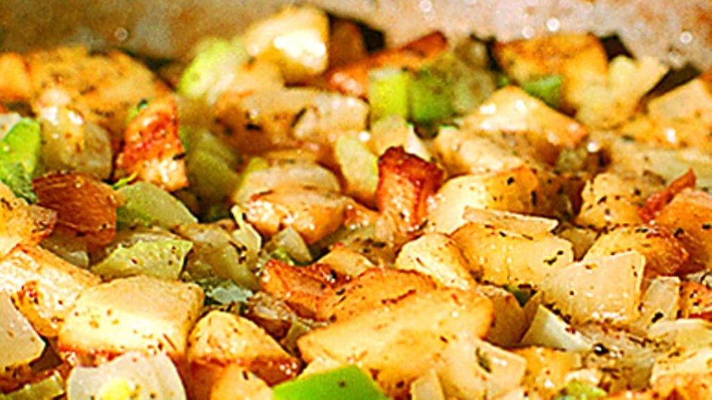 1. Kuori perunat ja kuutioi ne. Puhdista paprika ja sellerinvarsi ja kuutioi myös ne. Kuori ja silppua sipuli. Kuumenna öljy paistinpannussa ja ruskista perunat kullanruskeiksi.