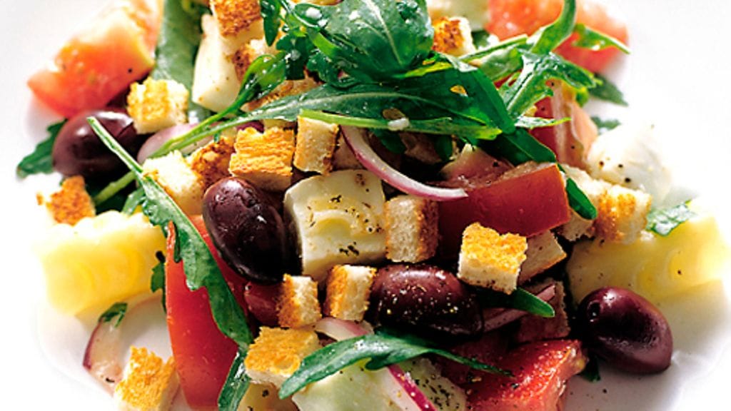 3. Koristele oliiveilla ja paahtoleipäkuutioilla. Mausta suolalla ja pippurilla.