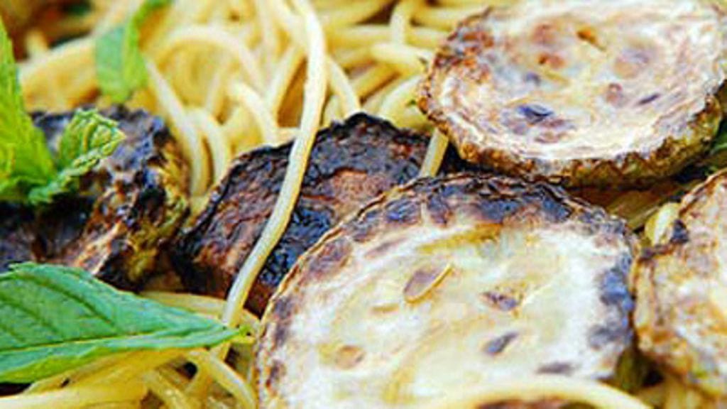 - Valuta pasta juuri ennen al dente -vaihetta ja laita kesäkurpitsojen paistamiseen käytetyn öljyn sekaan.