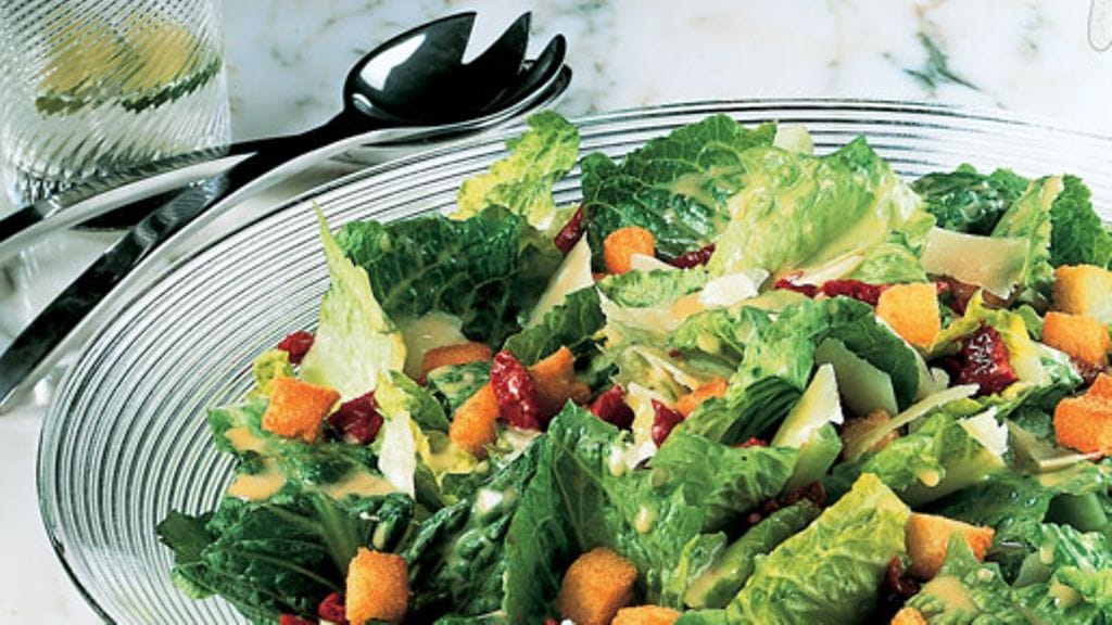 Revi salaatti ja sekoita aurinkokuivatut tomaatit joukkoon. Kaada kastike salaatin päälle ja ripottele pinnalle leipäkuutiot sekä Grana Padano juusto.