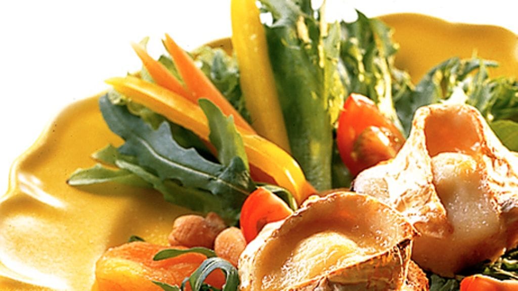 2. Jaa salaatinlehdet neljälle lautaselle. Suikaloi paprika ja leikkaa tomaatit lohkoiksi. Jaa paprikat ja tomaatit lautasille. Ripottele päälle pähkinöitä ja aprikooseja. Pirskota salaatinlehdille hieman öljyä ja viinietikkaa, pyöräytä pippurimyllyllä muutama kierros mustapippuria ja mausta vielä ripauksella suolaa.