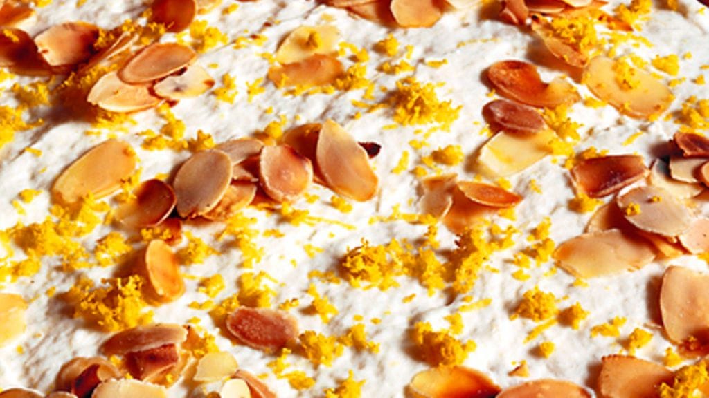 4. Vatkaa valkuaiset ja kerma erikseen. Kääntele ensin valkuaiset, sitten kerma munavaahtoon. Kaada täyte piiraskuoreen. Ripottele päälle raastettua sitruunankuorta. Paahda mantelit kuivalla pannulla ja ripottele piiraalle. Laita jääkaappiin muutamaksi tunniksi.
