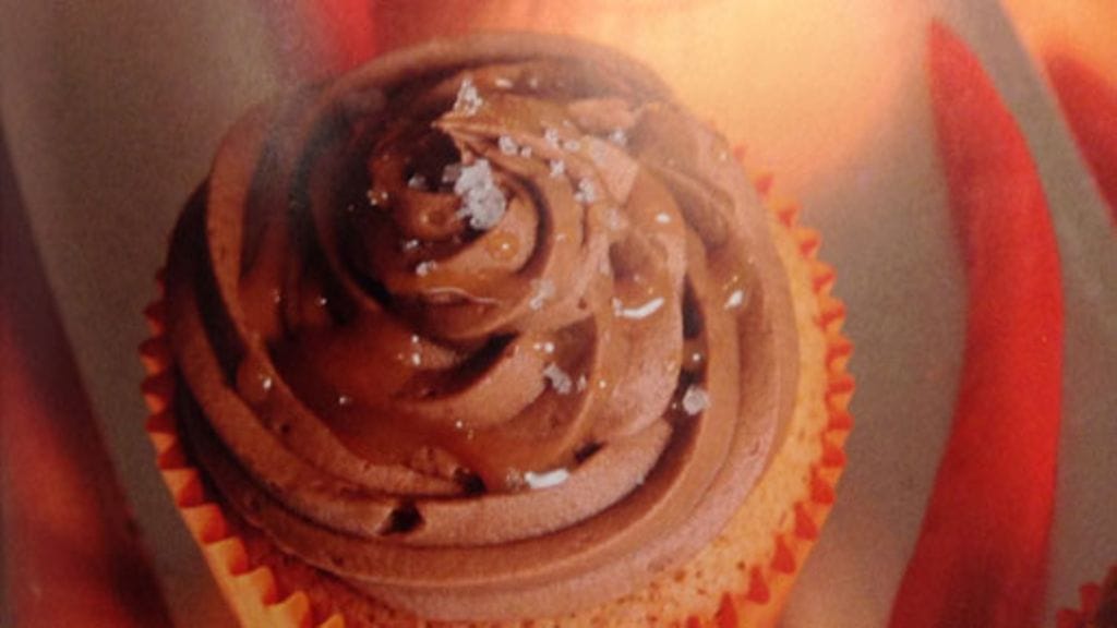 Tee kuorrutus: sulata kuorrutuksen tumma suklaa ja anna hieman jäähtyä. Vaahdota voi kuohkeaksi ja vatkaa jäähtynyt suklaasula sekaan. Lisää tomusokeri ja sekoita tasaiseksi. Jos seos muuttuu rakeiseksi, lisää hieman vettä, kunnes kuorrutuksen koostumus on sopivan pursotettavaksi. Kuorruta kakut täysin jäähtyneinä, valuta jokaisen kuppikakun päälle vielä kinuskikastiketta ja ripottele pinnalle sormisuolaa.