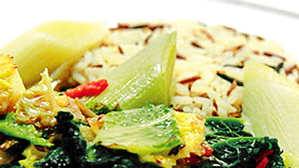 3. Höyrytä purjot tai hennot sipulit varsineen kypsiksi, valuta ja nosta lämpimille lautasille kaalin ja keitetyn villiriisin kera.