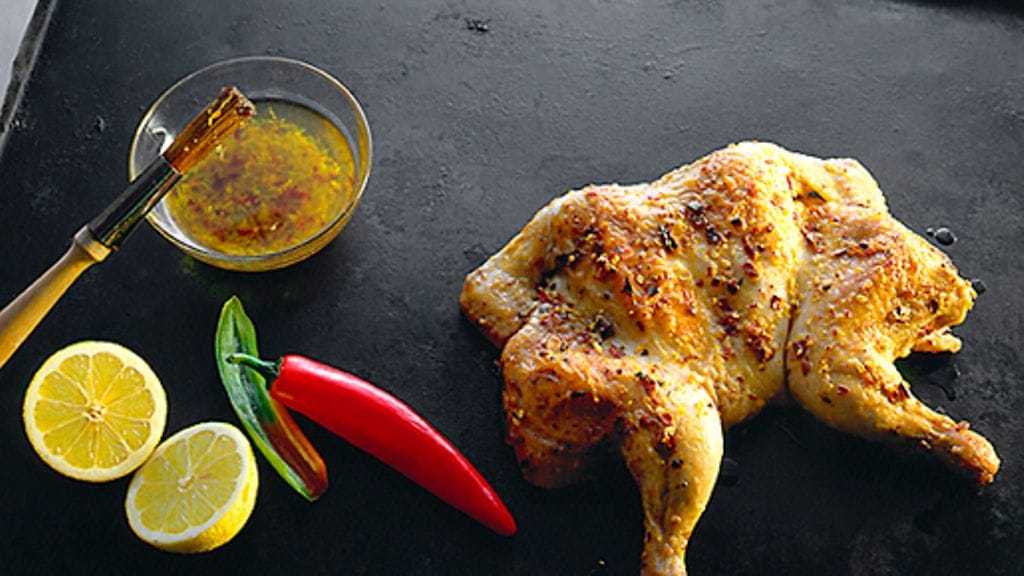 3. Aseta broileri ritilälle uunipannun päälle ja grillaa molemmilta puolilta. Se vie 20-30 minuuttia kummaltakin puolelta riippuen linnun paksuudesta. Voitele silloin tällöin paistamisen aikana.