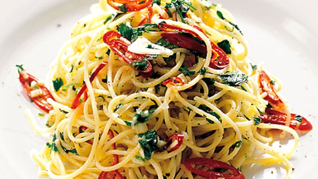2. Viipaloi valkosipulinkynnet ja chili ohuelti. Kuumenna paistinpannussa puolet oliiviöljystä ja kuullota valkosipuli- ja chilisilppu siinä. Kaada spaghettin joukkoon.