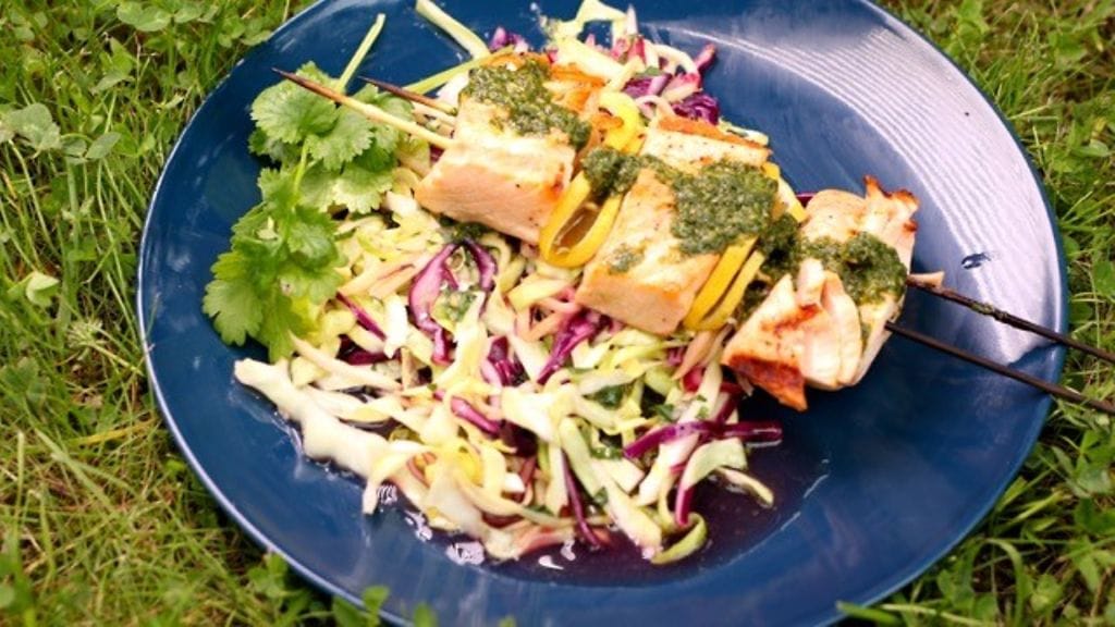 Kuutioi lohi tasakokoisiksi kuutioiksi. Viipaloi 2/3 sitruunaa ohuiksi viipaleiksi. Purista loppuosasta mehut lohikuutioiden päälle, lisää myös hiukan suolaa ja pippuria. Pujota lohikuutiot vuoron perään kahtia taitetun sitruunaviipaleen kanssa tuplavartaisiin. Kaksi varrasta vierekkäin estää lohen pyörimisen vartaassa. Muista liottaa puisia vartaita pari tuntia vedessä ennen pujottelua, etteivät ne pala grillissä.