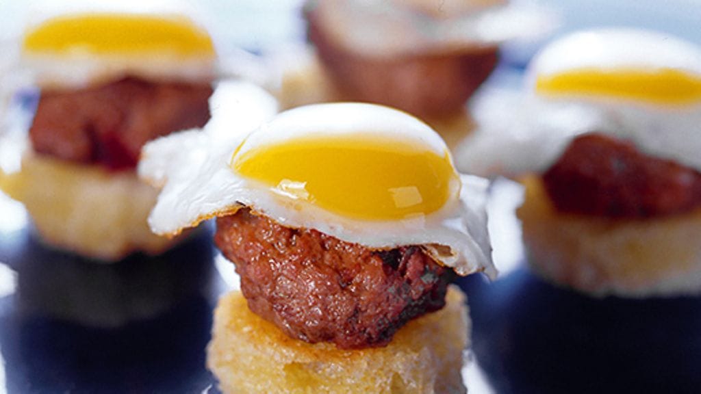 3. Kuumenna öljy paistinpannussa. Riko viiriäisenmunat niin, että ensin pistät terävällä veitsellä niiden kuoreen reiän. Valuta munan sisus varovasti kämmenelle ja liu'uta siitä pannulle raaputtaen veitsellä valkuainen iholta. Paista munat miedolla lämmöllä, kunnes valkuainen on hyytynyt kokonaan. Nosta jokaiselle pihville muna ja tarjoile heti.