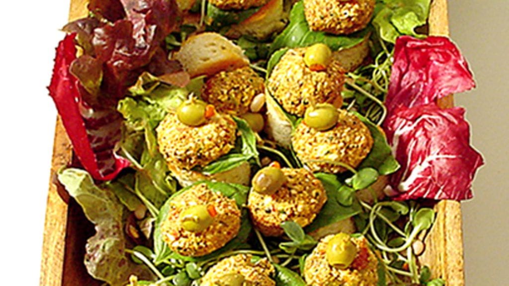 2. Leikkaa tomaatit pienemmiksi paloiksi. Sekoita fetajuusto, tomaattipalat ja oliivit sekä oliiviöljy seokseksi sauvasekoittimella. Muotoile pieniä palloja.