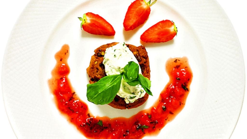 1. Jäädyke: Sekoita basilika ja jogurtti tehosekoittimessa. Vatkaa keltuaiset, hunaja ja sokeri valkoiseksi ja ilmavaksi. Lisää jugurtti ja vatkattu kerma, täytä pieniä vuokia taikinalla ja jäädytä.
