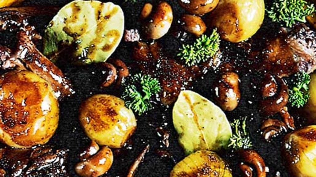 2. Ruskista lihat voissa pannulla ja siirrä sitten pataan. Ruskista myös kuutioitu, savustettu siansivu, sipulit ja kokonaiset sienet ja siirrä kaikki pataan. Lisää timjami ja laakerinlehdet ja kaada päälle viini.