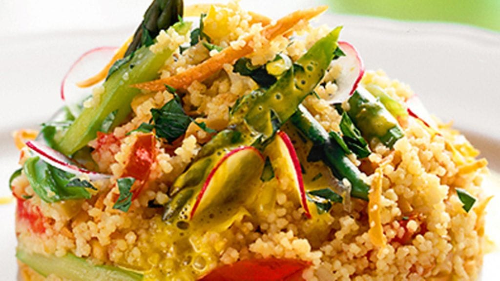 Kuumenna vesi kiehuvaksi kattilassa, lisää voi, sitruunamehu ja sitruunankuori, suola ja pippuri. Lisää kuskus ja laita kansi päälle. Ota kattila liedeltä ja anna kuskusin turvota 6-7 minuuttia. Puhdista parsat ja paloittele ne. Kuori ja suikaloi porkkana. Suikaloi sokeriherneet. Keitä kevyesti suolattua vettä ja ryöppää parsat, porkkana ja sokeriherneet. Nosta vedestä ja valuta.