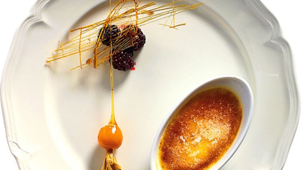 3. Kehrätty sokeri: Kuumenna paistinpannu ja sulata sokeri vaaleanruskeaksi ja sitkeäksi. Kasta haarukka sokeriin ja vetele siitä nauhoja, anna niiden jäähtyä leivinpaperilla. Koristele brûléet kehrätyllä sokerilla sekä marjoilla.