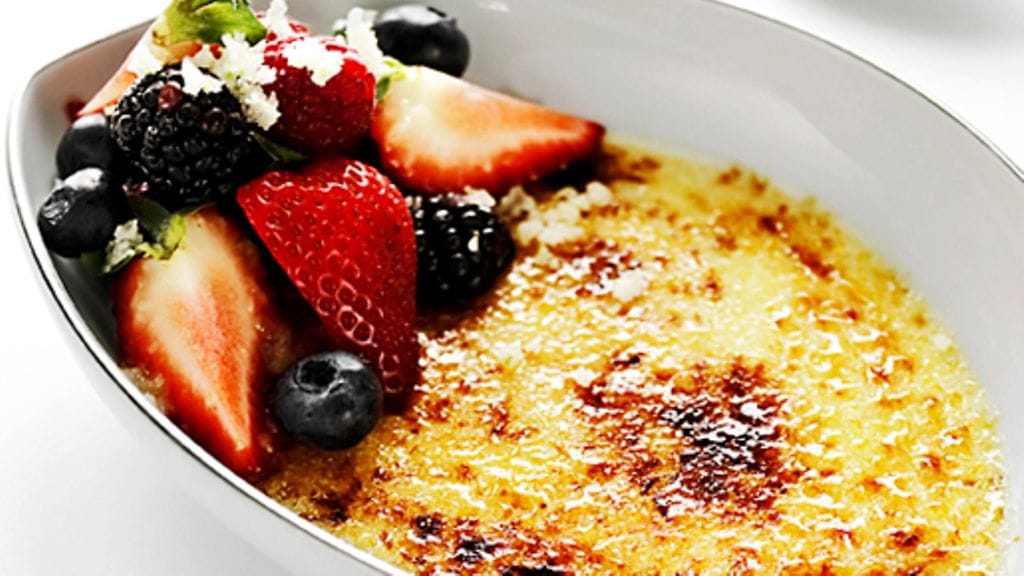 1. Kuumenna uuni 100 asteeseen. Sekoita kerma ja maito kattilassa. Halkaise ja raaputa siemenet vaniljatangosta ja laita sekä tanko että siemenet kermamaitoon, kiehauta. Nosta vaniljatanko keitoksesta. Sekoita keskenään munankeltuaiset ja 3/4 dl sokeria ja sekoita sitten lämmin kermamaito munaseokseen. Kaada seos annosvuokiin.