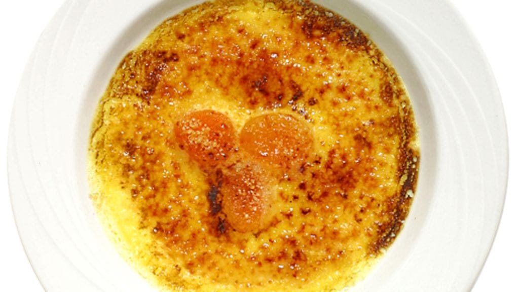 3. Kuumenna uuni 125 asteeseen. Valuta aprikoosit hyvin ja suikaloi ne, laita aprikoosisuikaleita 4 matalahkon annosvuoan pohjalle. Kaada päälle brûléetaikina. Paista vesihauteessa uunissa n. 1 tunti. Anna jäähtyä kokonaan. Juuri ennen tarjoilua, kuumenna uuni 275 asteeseen ja napsauta grillivastus päälle. Ripottele raakasokeri brûleiden päälle, laita vuoat uuniin muutamaksi minuutiksi kunnes sokeri on sulanut.