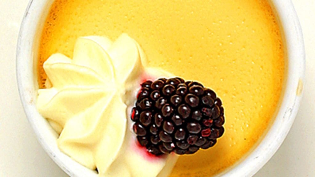 1. Laita uuni lämpiämään 200 asteeseen. Sulata sokeri kuivassa paistinpannussa liedellä, lisää vesi ja sekoita huolellisesti. Sokerin pitää olla teen väristä, varo polttamasta sitä! Lämmitä 4 uuninkestävää annosvuokaa ja kaada sokeriseos niihin. Muista, että se on tulikuumaa, käytä mielellään patakintaita. Kääntele vuokia niin, että karamellikastike vuoraa koko niiden sisäpinnan.