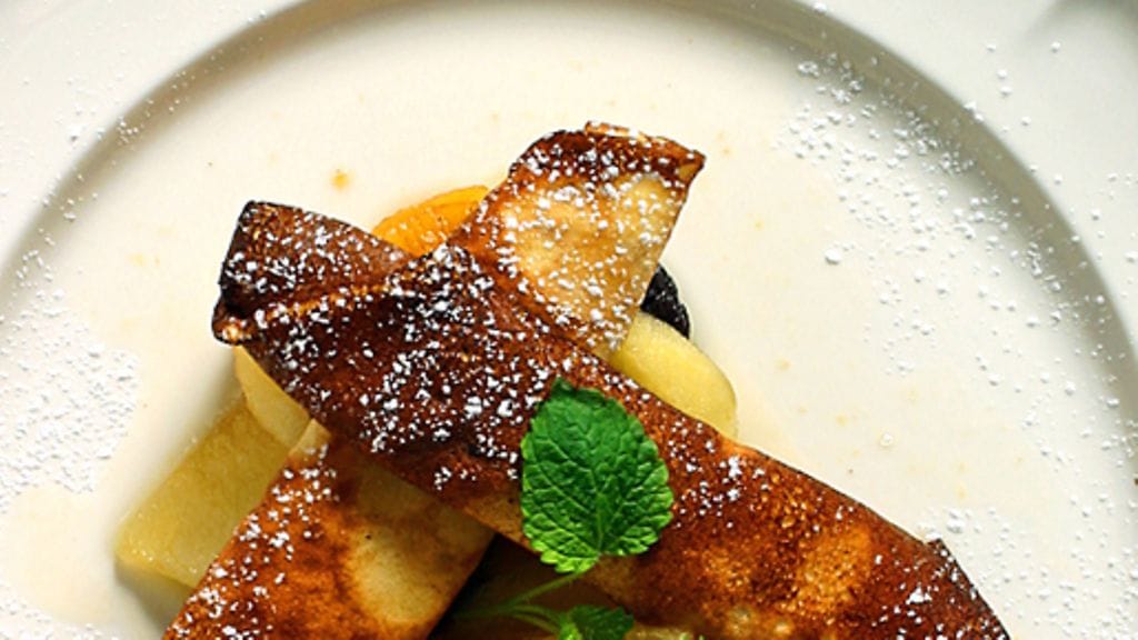 1. Crêpes: Vatkaa kananmunat, munankeltuaiset, sokeri, vesi, tilkka maidosta sekä vehnäjauhot tasaiseksi taikinaksi. Sulata voi ja lisää taikinaan. Lisää kerma, loput maidosta ja viimeiseksi suola. Sekoita hyvin ja siivilöi. Paista niin ohuita crêpesejä kuin mahdollista, pidä lämpiminä.