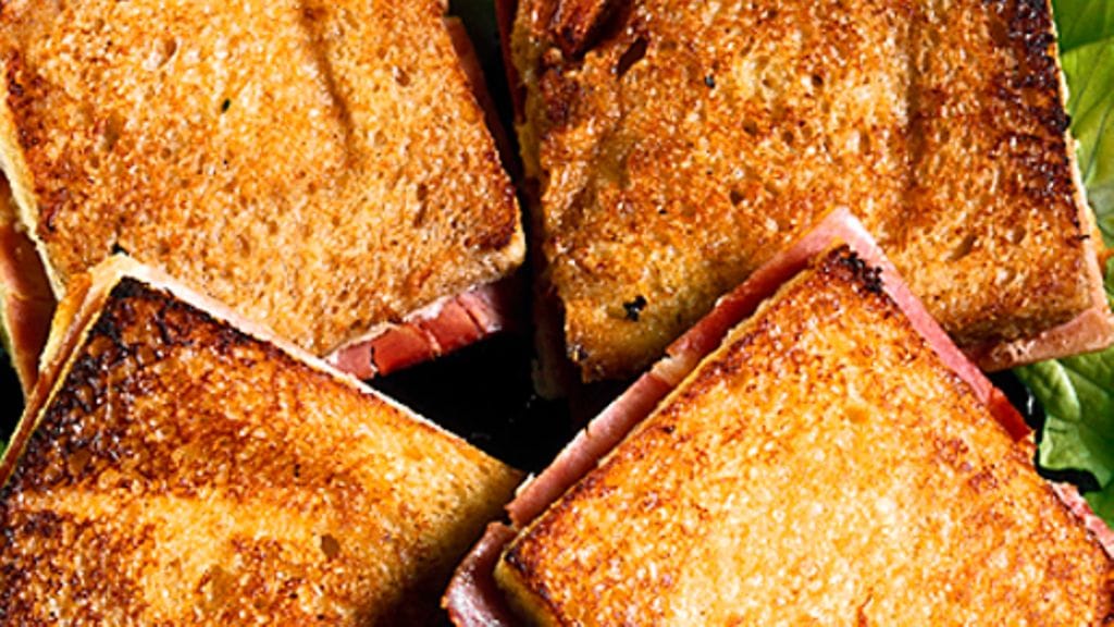 1. Voitele leivät kevyesti. Laita neljälle viipaleelle kinkkua, levitä päälle hieman sinappia ja peitä juustolla sekä lopuilla leivillä, voipuoli alaspäin.