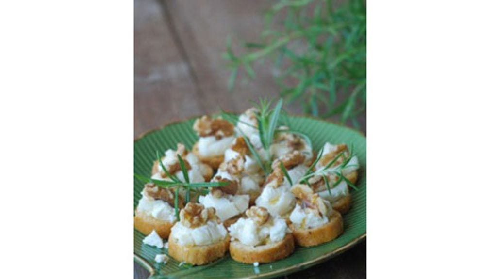 Ota vuohenjuusto huoneenlämpöön, jotta sen rakenne ja maku on parhaimmillaan. Paahda saksanpähkinöitä paistinpannulla. Leikkaa vuohenjuuston kuivat reunat pois ja laita n. 1 tl juustoa jokaisen crostinin päälle. Laita saksanpähkinän puolikas juuston päälle ja valuta vielä hieman hunajaa crostinin päälle. Koristele halutessasi rosmariinilla.