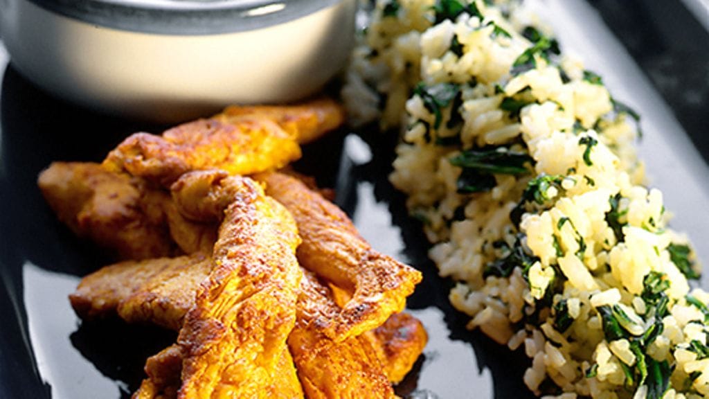 2. Pinaattiriisi: Huuhdo pinaatti ja revi paloiksi, leikkaa pois paksut lehtiruodit. Hienonna sipuli ja kuullota öljyssä yhdessä riisin kanssa hetki. Lisää vesi ja suola. Kuumenna kiehuvaksi ja anna kiehua hiljaa 15 minuuttia. Lisää pinaatti ja hauduta vielä 10 minuuttia, kunnes riisi on kypsää.
