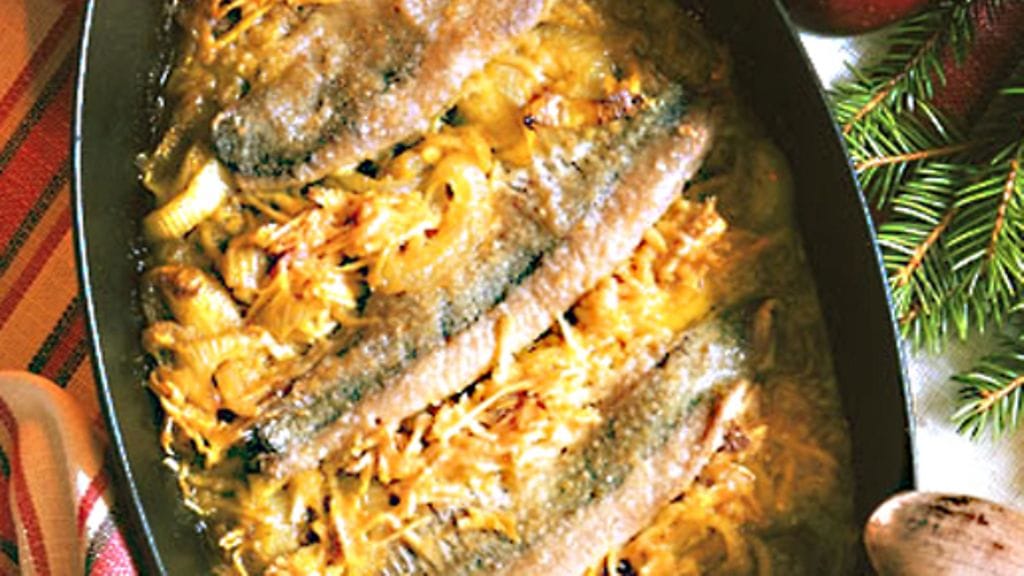 3. Asettele päälle sillifileet ja kaada päälle kermaa. Sihtaa päälle korppujauhoja ja laita päälle margariininokareita. Gratinoi uunissa 10-15 minuuttia.