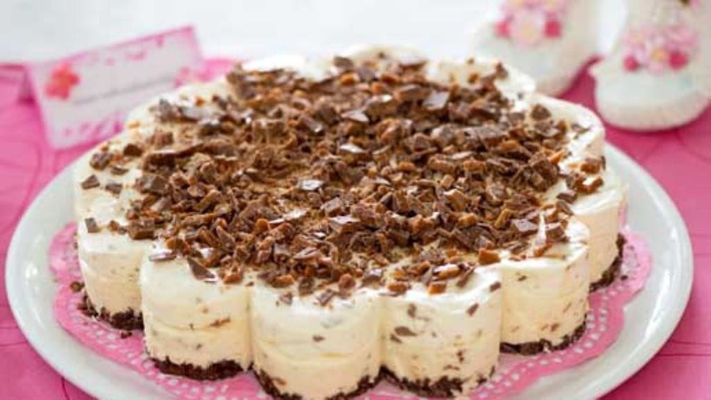 Murskaa Domino-keksit esimerkiksi lihanuijalla pienessä pussissa. Sekoita joukkoon sulatettu voi. Laita keksi-voiseos leivinpaperilla vuorattuun irtopohjavuokaan tai reunavuoan pohjalle.