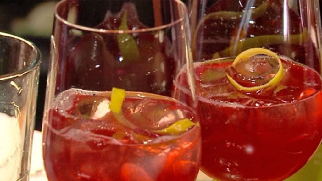 5. Kiepsauta juoman sekaan pala sitruunankuorta ja koristele esimerkiksi punaherukoilla