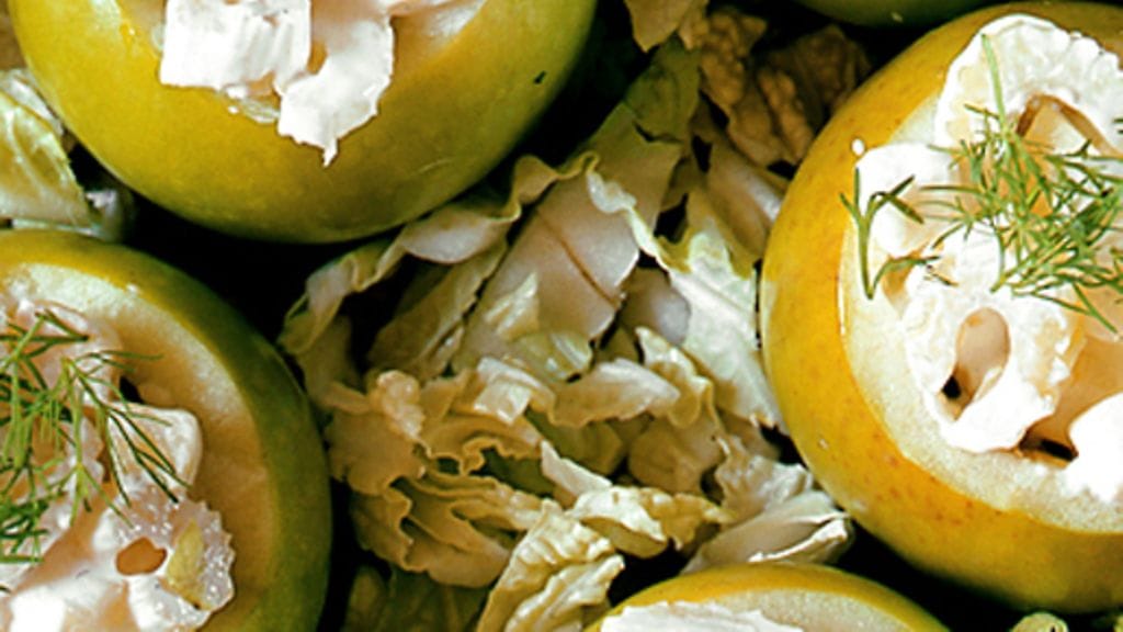 2. Suikaloi pari lehtisellerin vartta, kuutioi kurkku pieneksi ja viipaloi herkkusienet. Hienonna koverrettu omenan hedelmäliha. Sekoita kaikki kermaviilin kanssa kulhossa, mausta suolalla, pippurilla ja sitruunalla. Täytä omenat, koristele tillillä.