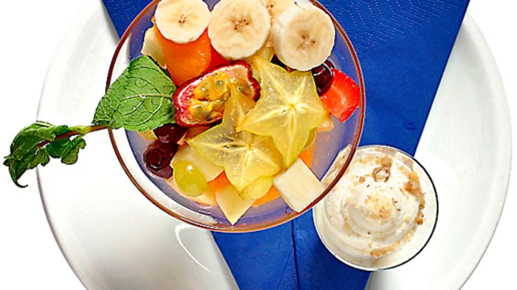 3. Hienonna pähkinät. Vatkaa kerma ja lisää pähkinärouhe. Viipaloi karambola, lohko passiohedelmä. Laita hedelmäsalaatti annoskulhoihin ja koristele karambolalla ja passiohedelmällä. Tarjoile kerma erillisestä astiasta.