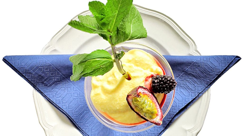 3. Jaa hedelmävaahto annoskulhoihin ja laita kylmään tarjoiluun asti. Koristele hedelmillä tai marjoilla ja mintunlehdillä.