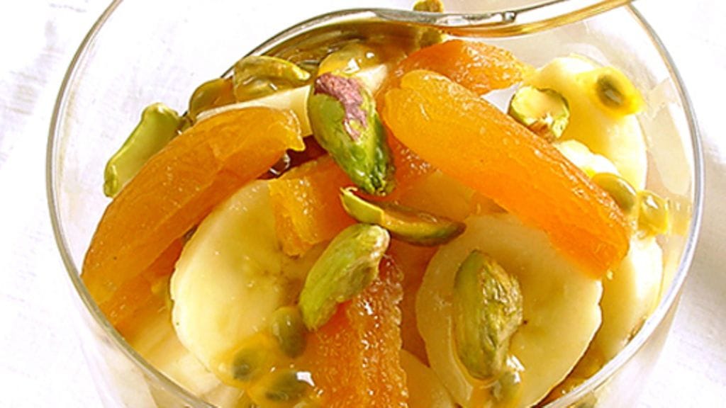 2. Kerrostele banaaniviipaleet, aprikoosisuikaleet ja passion-hedelmää neljään korkeaan lasiin tai maljaan.