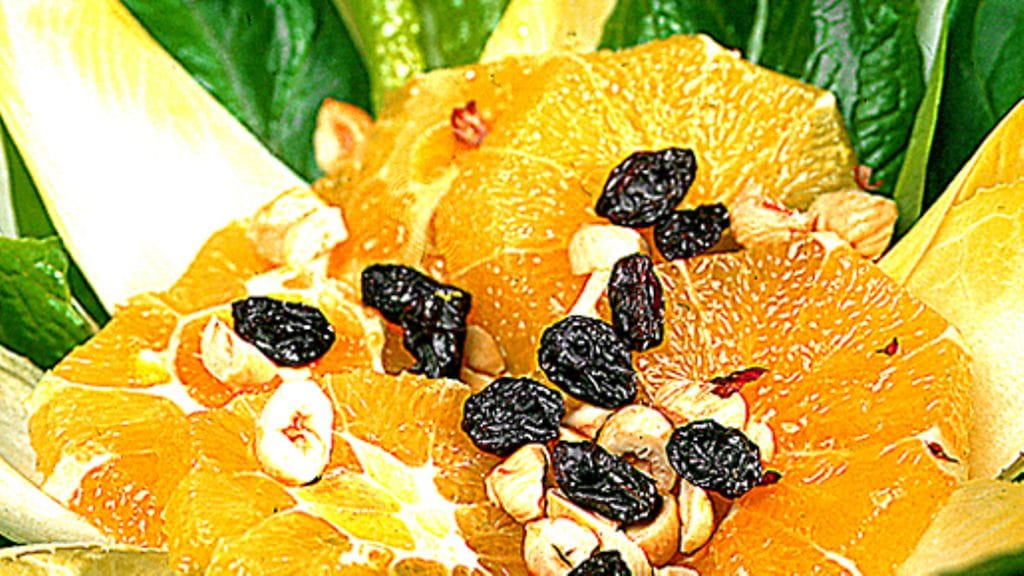 2. Irrota endiiveistä ja roomansalaatista lehdet ja asettele ne tarjoiluvadille. Levitä päälle appelsiiniviipaleet. Ripottele pinnalle pähkinärouhetta ja rusinoita. Kaada kastike salaatin joukkoon juuri ennen tarjoilua.