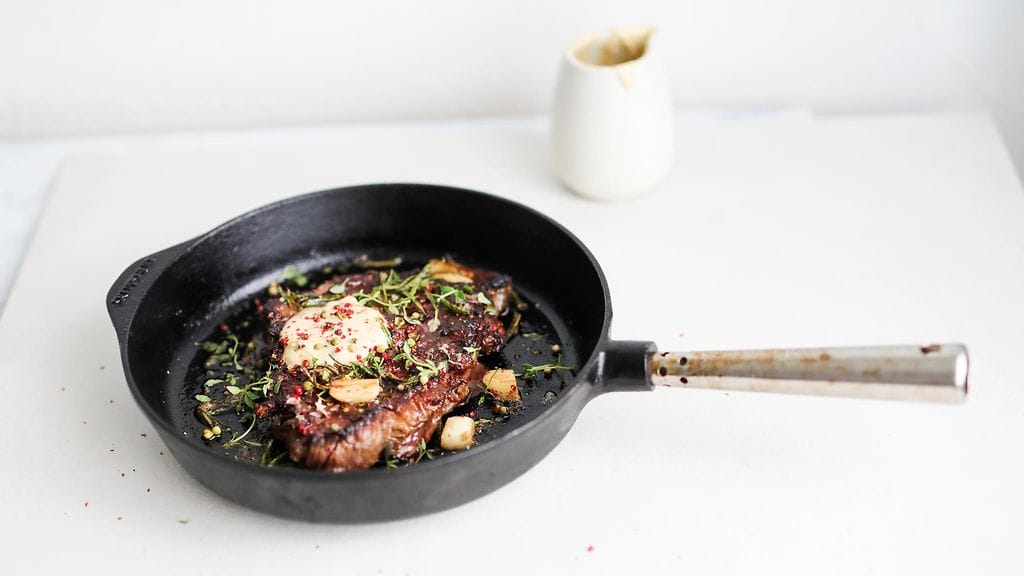 Ota pihvit huoneenlämpöön vähintään tunti ennen paistoa. Lämmitä valurautapannu kuumaksi ja lisää öljy. Kun öljy on tulikuumaa, lisää voi ja valkosipulinkynnet sekä rosmariinnoksat. Mausta pihvit pippurilla ja suolalla kummaltakin puolelta. Paista pihvejä pari minuuttia/puoli, riippuen siitä, miten kypsäksi lihan haluat. Jos valkosipulit alkavat mustua ja palaa, heitä ne pannulta pois, ne ovat jo antaneet makunsa lihalle. Ota pihvit pois pannulta ja anna niiden levätä sen aikaa kun valmistat kastikkeen.