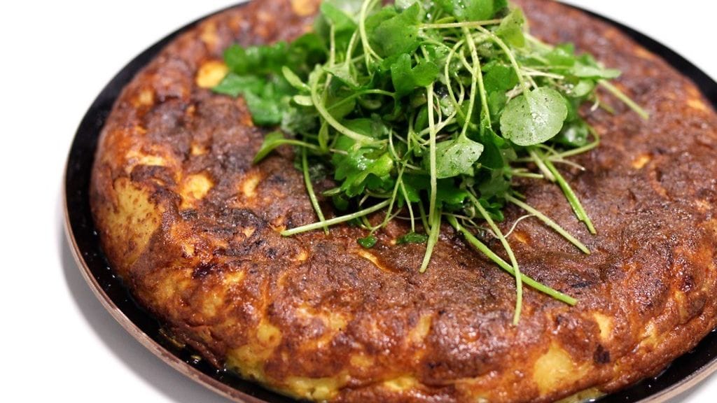 Lisää pieni määrä oliiviöljyä samalle paistinpannulle, jolla paistoit perunat. Kaada peruna-munakasseos pannulle ja paista keskilämmöllä kannen alla 10-15 minuuttia. Kun munakkaan pohja on kypsä (kurkkaa paistinlastan avulla) ja munakas pysyy koossa, kippaa munakas lautaselle ja liu'uta takaisin pannulle. Anna paistua muutama minuutti lisää ja liu'uta sitten munakas takaisin lautaselle. Valmis tarjoiltavaksi!